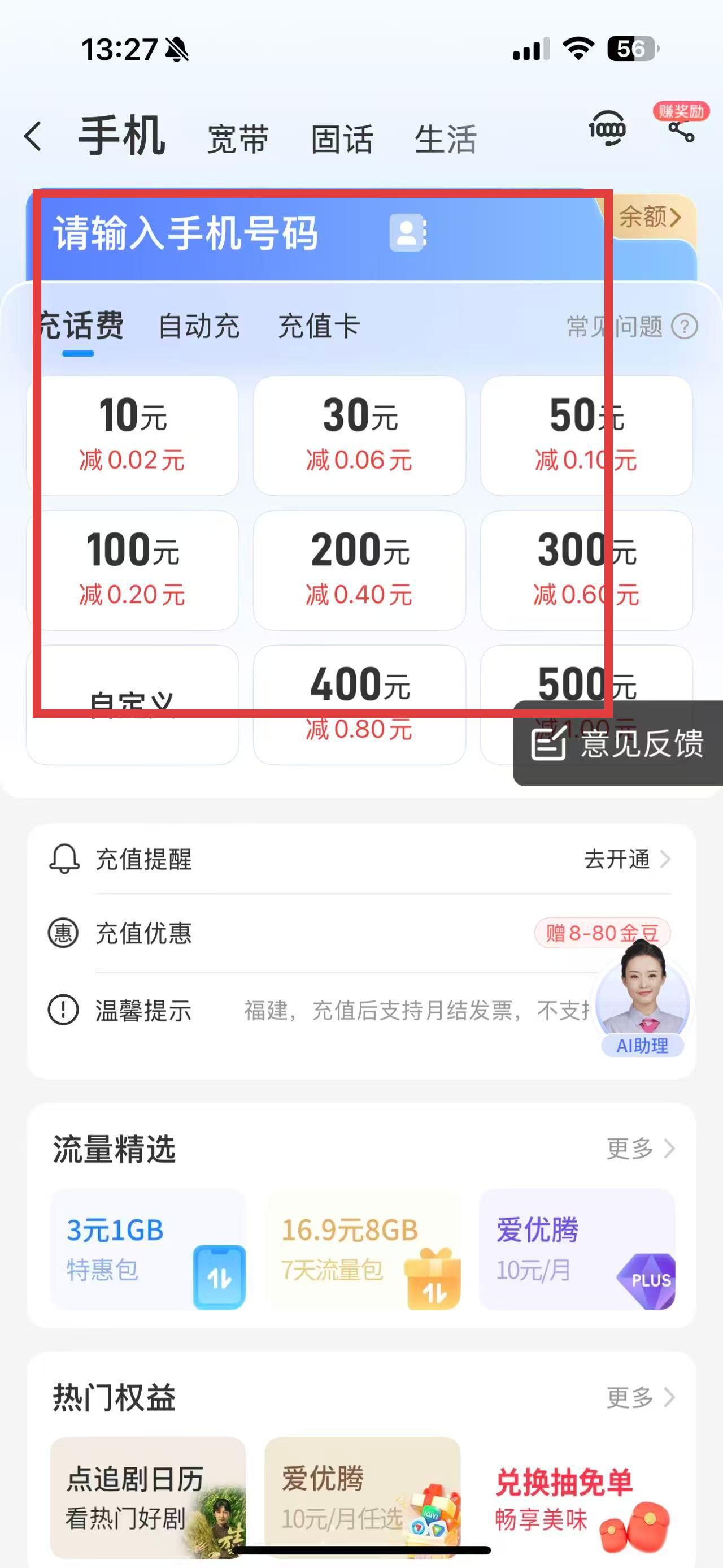 3、进入手机充值页,输入手机号码,选充值金额,按流程完成话费充值。