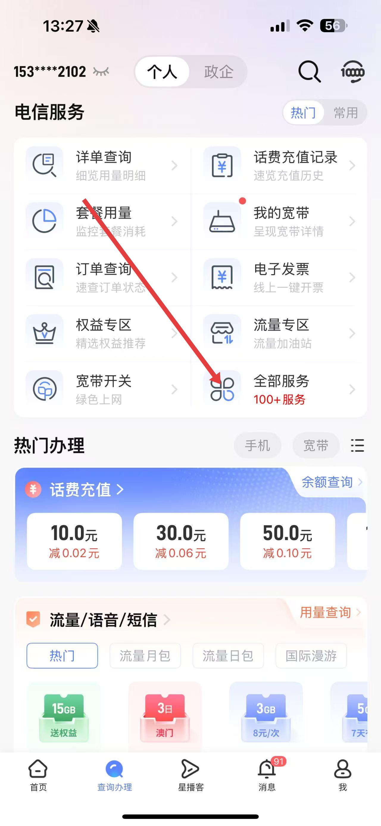 1、打开中国电信APP,进入查询办理页,在电信服务中点击全部服务。