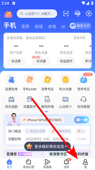 1、打开中国电信APP,点击右下角我,进入个人的页面。