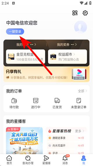 2、在个人的页面中,点击一键登录,进入登录选择的页面。