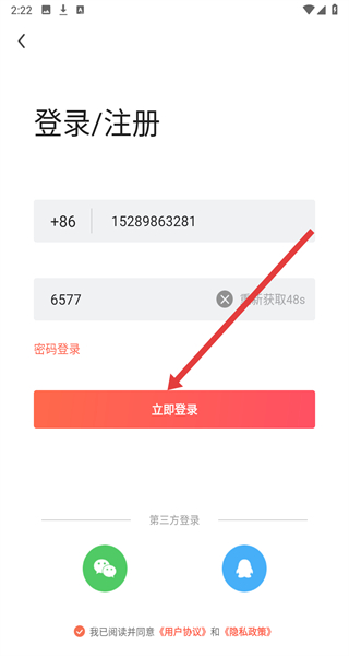 4、输入收到的验证码后,点击“立即登录”,完成账号注册登录流程。