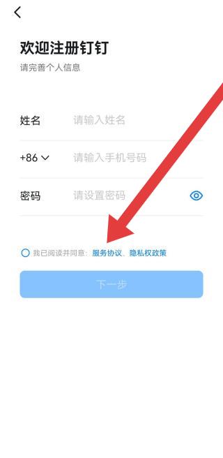1、注册钉钉时,填写姓名、手机号、密码,勾选服务协议、隐私政策后,点击下一步推进注册。
