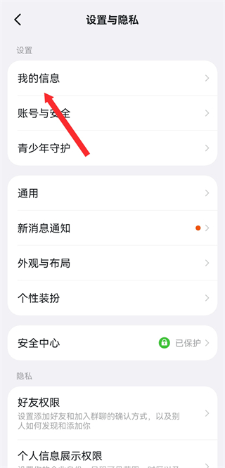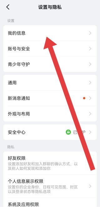 3、在设置与隐私界面,点击我的信息,进入个人资料页面。