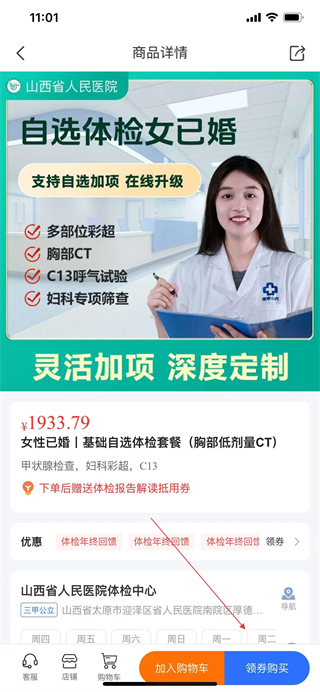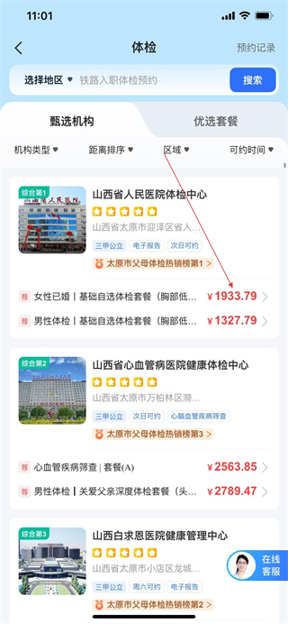 2、进入体检页面后,选择目标体检机构及对应的体检套餐。