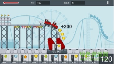 您需要控制4D电影院中的座椅模拟过山车的行进路线,在行进中您会遇到向上,向下的箭头和代表向左,向右的钻石,请将对应的驱动拖拽到座椅的空缺处,让座椅配合过山车上下左右运动。