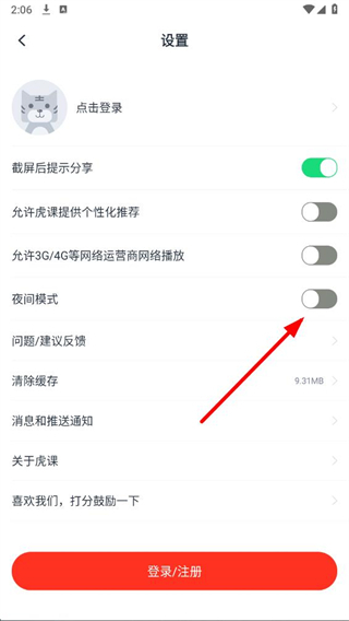 3、在设置页面,找到夜间模式选项,点击其右侧的开关按钮将其开启即可。