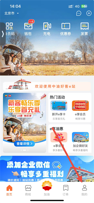 1、打开中油好客e站APP,进入首页后,点击底部导航栏最右侧的我的选项,进入个人中心页面。