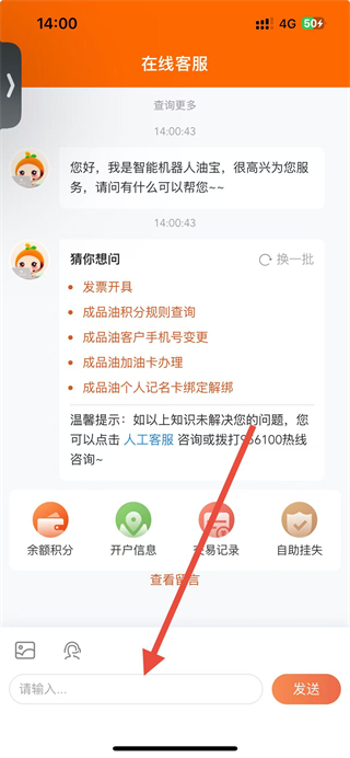 3、在在线客服界面,可直接在输入框中填写需咨询的内容,也可选择猜你想问里的选项快速咨询。