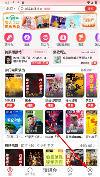 1、在猫眼电影app界面底部,点击我的选项进入对应页面。