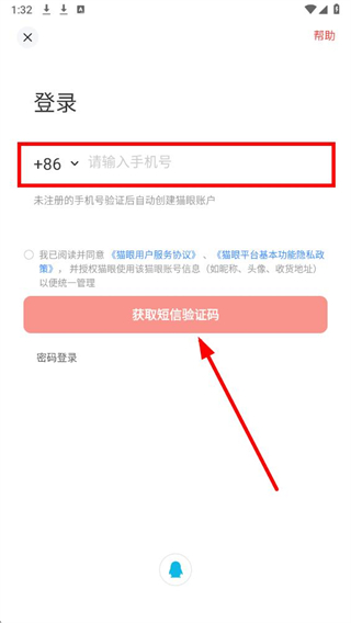 3、在登录界面输入手机号码,勾选同意相关协议后,点击获取短信验证码。
