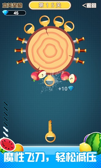 魔性的休闲街机切水果游戏玩法,由于水果会不断旋转,玩家需要瞅准时机,发射手中的飞刀,切碎所有的水果,榨取果汁,享受果汁飞溅的乐趣,走进水果忍者的世界。如果失误miss,刚挑战失败。游戏中收集的钻石可以用于解锁更多的飞刀款式