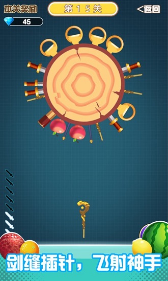 快速反应益智闯关类游戏玩法,玩家需要通过触碰屏幕,将飞刀向往旋转的转盘中,玩家可以通过命中水果加分,但是如果碰到了钉子或之前打出的飞镖,则视为闯关失败,为你提供畅快的射击大作战体验