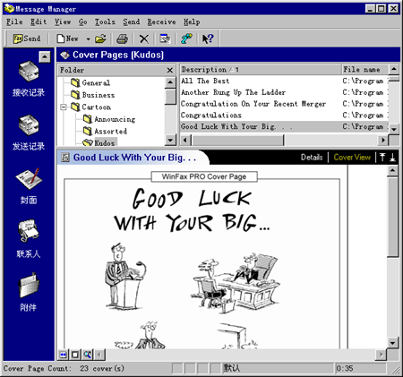 WinFax Pro是赛门铁克公司出品的传真软件。集发送、接收、管理传真等诸多功能于一体,除了普通传真软件基本功能外,还能够以电子邮件的形式向任意一台传真机发送传真,大大降低长途传真的费用。即使是发送图片时也能够最大限度保留图片的质量,当对方收到传真时看到的是高清图片而不是一片模糊。