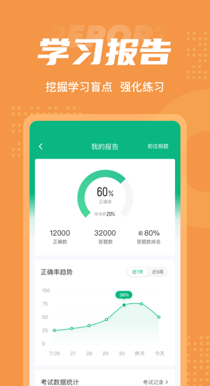 成绩单实时记录考试数据,一点一滴的反馈考生近期学习状态以及自我正确率的提升,大大的给予考生通过考试的信心。
