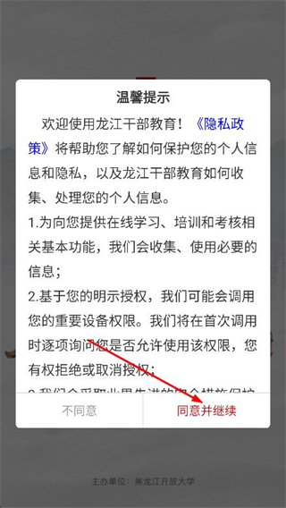 1、打开龙江干部教育,在弹出的提示框中点击同意并继续。