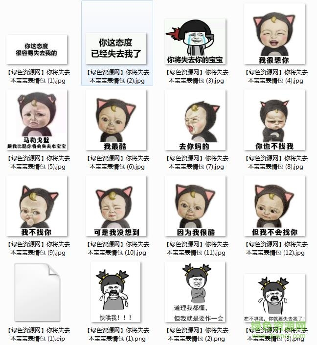 很容易失去宝宝表情包这款表情可以是闺蜜之间使用基友之间使用,也可以是情侣之间使用,使用范围十分广泛,反正能够让你的小伙伴那你毫无办法,这个系列的表情包十分有趣,快阿绿色资源网下载吧!