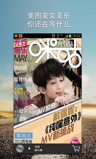 4、 图文并茂,视听新体验——音乐杂志图文并茂,读起来体验有趣,内嵌的音乐可以在线试听播放,还能把喜欢的歌曲下载到手机里,或设置成彩铃。