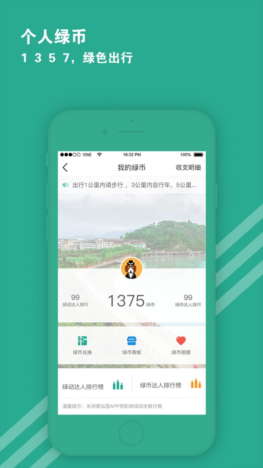 1)绿币功能。支持接入iPhone健康数据,特别推出“1357绿色出行”绿币兑换功能;
