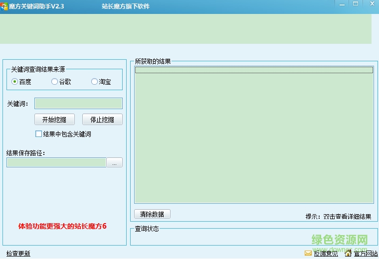 魔方关键词助手是一款非常实用的seo关键词优化工具,通过这款软件可以快速挖掘长尾词,操作简单,使用方便快捷,感兴趣的朋友欢迎来绿色资源网下载体验!
