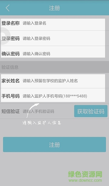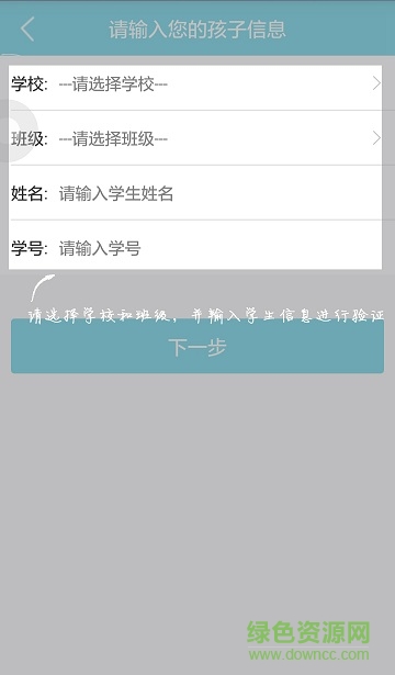 第一步:验证学生信息,点击右下角“新用户注册”,然后选择学生的“学校”和“班级”。并输入学生的“姓名”和“身份证号或学号”。(学号印刷在校园卡上)