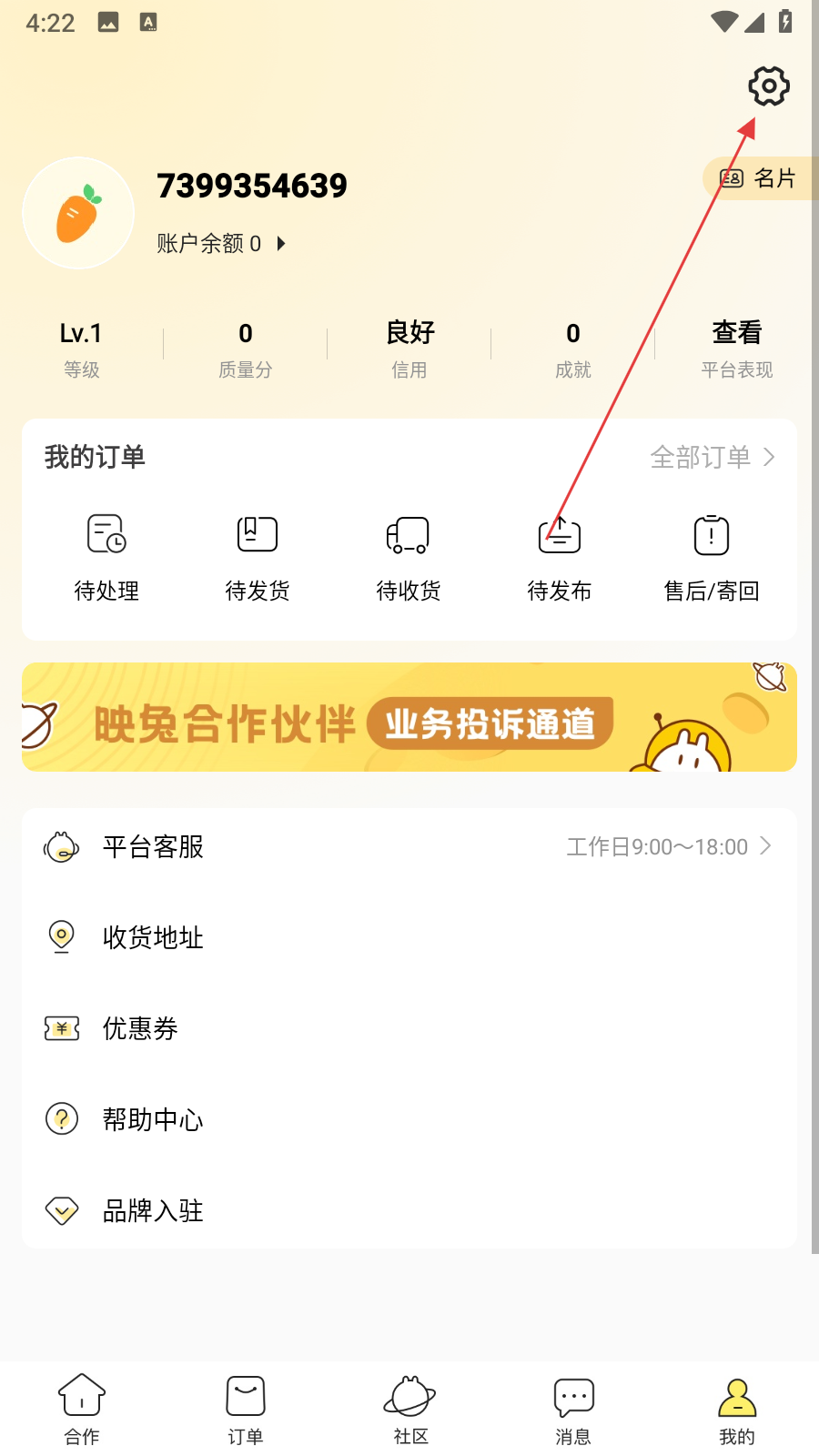 1、打开映兔APP,进入我的页面,点击右上角的设置图标。