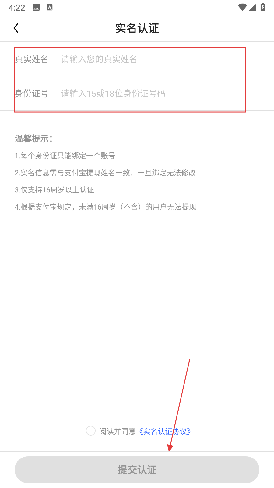 4、在实名认证页面,输入真实姓名和15或18位身份证号码,点击提交认证。