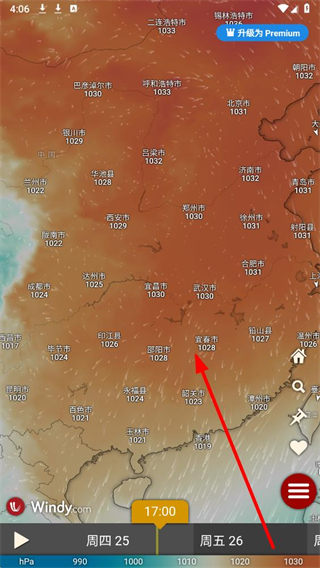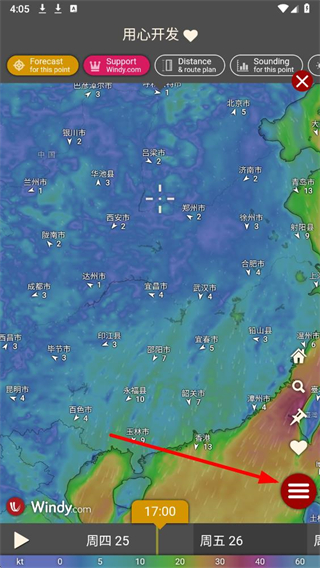 1、打开Windy app,点击右下角红色菜单按钮,展开功能菜单。