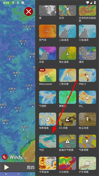 3、在更多图层列表里,找到气压对应的图层选项并点击,加载气压相关的地图数据。