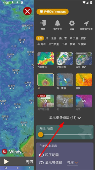 2、在功能选项栏中,点击显示更多图层选项,展开更多天气图层的选择列表。