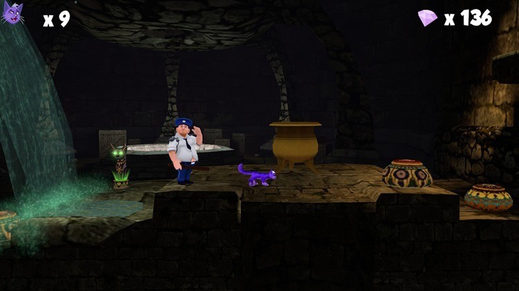 玩家要控制的不仅仅是主人公凯西,还有一只紫色的喵星人。左边有一个切换按钮可以随时进行人猫之间的切换,有的机关需要人来触动,有的地方则需要喵星人出马。左下角的两个按钮可以控制左右移动,右下角的几个按钮分别是攻击、跳跃和控制机关。人猫搭配,过关不累,你可以控制喵星人跳到主角的头上,再控制主角带着喵星人行动,可不要把你的小伙伴给弄丢了。