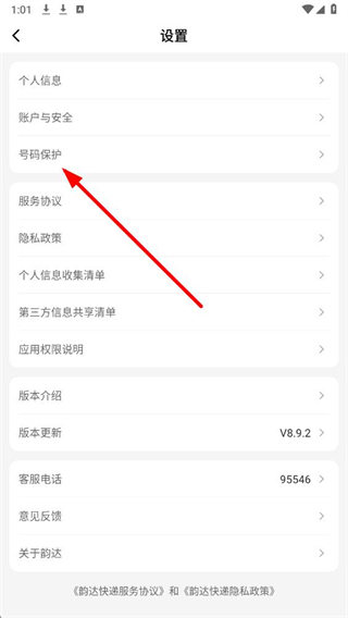 3、在设置页面,点击号码保护选项,进入号码保护的功能页面。