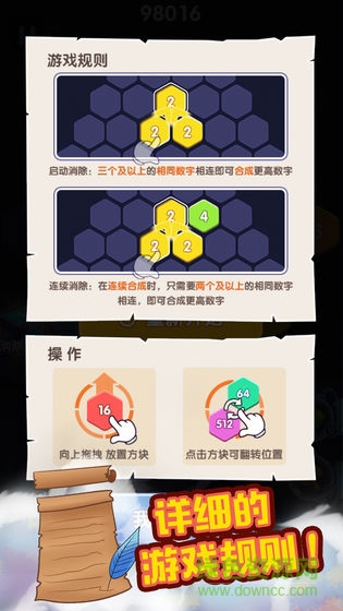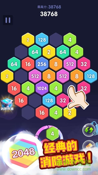 1、经典的2048消除原理,高难度的六边形增加了更多消除的机会,也增加了难度;