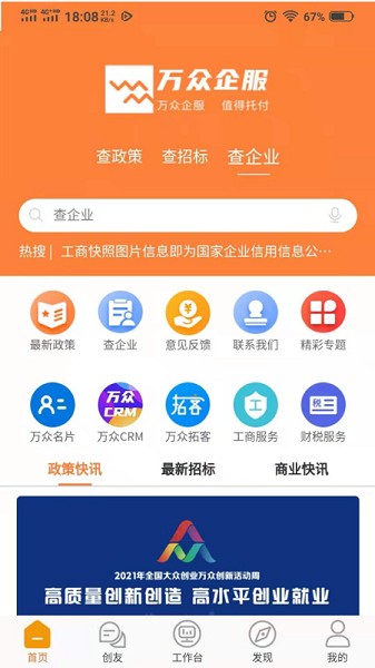 万众企服平台是专门为企业服务的应用,应用主要功能为政策服务 ,企业分享,最新资讯,活动展示,招投标信息等众多企业服务功能为一体的应用