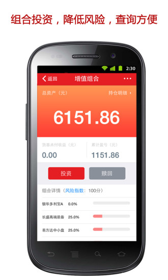 4、一键购买,财务管理。用户可以对多只基金批量购买,并按不同计划独立运作、计算。
