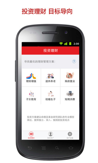 1、资产配置,钱景私人理财综合考量每个投资用户不同的理财需求、风险偏好、财务状况、家庭结构,为理财用户定制出专属的理财配置方案。