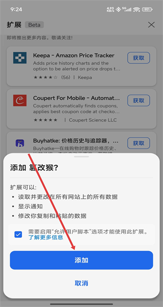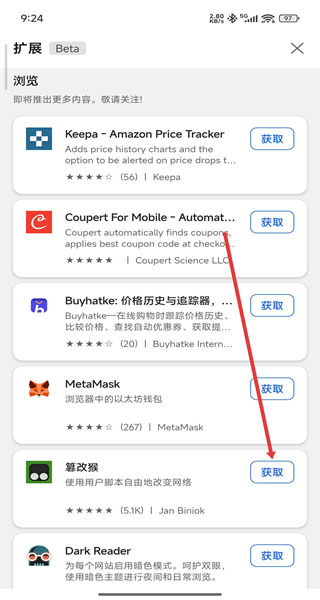 3、在进入到扩展页面中后,可以在下方找到需要添加的程序,点击获取按钮进行添加。