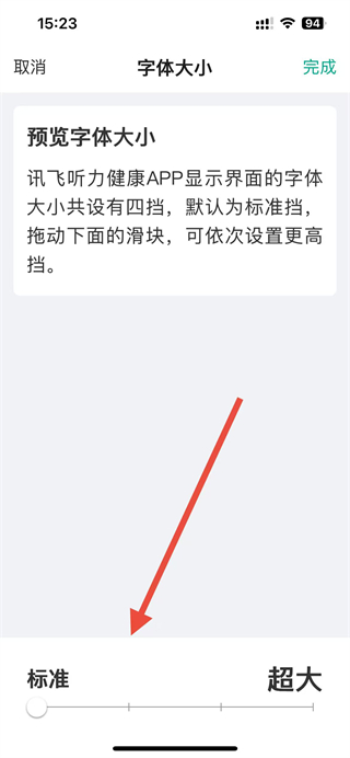 4、在字体大小设置界面,拖动滑块选择,选择完成后点击完成按钮,即可修改字体大小。