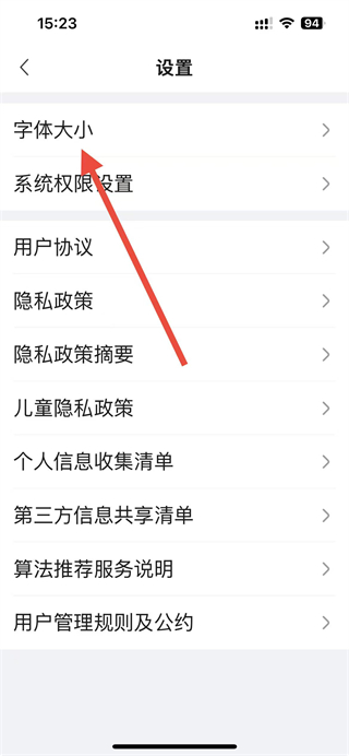 3、在设置界面,点击字体大小选项,进入字体大小设置界面。