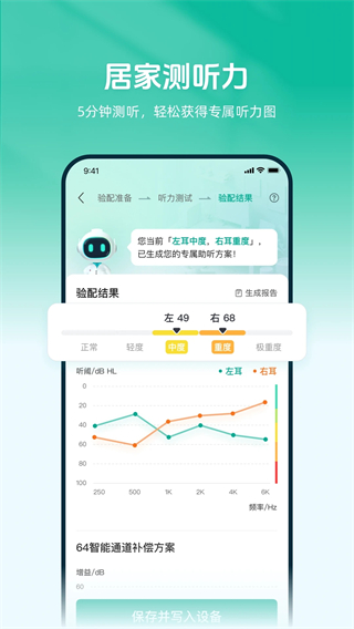 听力测试:左右耳共16个频点全覆盖,10分钟即可自助完成测听。