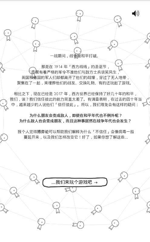 进入游戏后,就有一个沉重而现实的问题摆在我们面前,不管是在战争年代还是在和平年代,甚至在当前我们生活的2017年,人与人之间彼此的信任太差了,朋友也会变成敌人,这是为什么?如果你想要了解这些问题,那么就开始玩个游戏吧↓