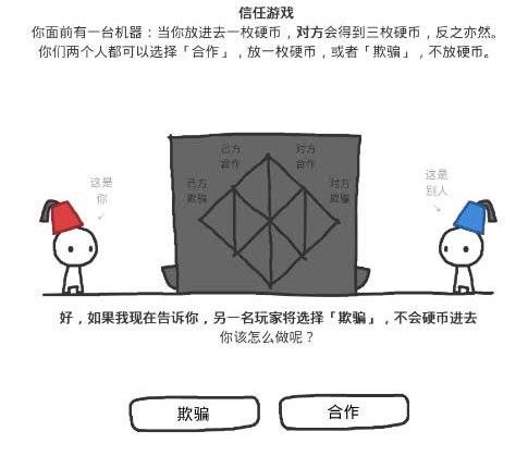 游戏开始的玩法很简单,在「欺骗」与「合作」做个选择。当你和你的对手分别投出1元硬币,你们将同时获得2枚硬币。若你或你的对手不投硬币,而对方投入了硬币,则不投硬币者将获得3枚硬币,投硬币的人将损失一枚硬币,若2人都不投硬币,则均无收获。你会做出什么选择?