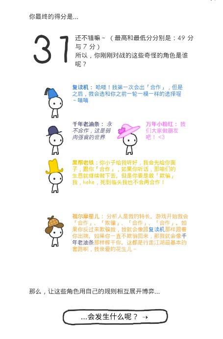 被老油条欺骗成功了一次,我面对小粉红时谨慎了很多,粉色帽子可能是一位女性,游戏里的女性可能是好人吧?我和小粉红合作了两次,第三次由于我被老油条骗了一次我为了补偿回来,我选择了欺骗。