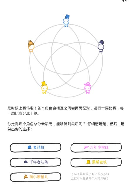 在游戏中,我们最先接触到的对手有五个,分别是复读机、千年老油条、万年小粉红、黑帮老铁、福尔摩星儿,每个人物都有非常鲜明的特征,这些特征会贯穿整个游戏,并随着游戏的进程逐步深入剖析它们。