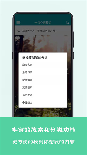 一句心情签名app是一款每日一推的美文和正能量句子的心情语录app,励志的话语配上精美的背景,给你带来全新好心情的一天,来绿色资源网下载试试吧!