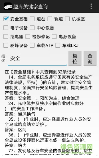 3、电务作业指导书题库学习:题库共有安全基础、道岔维护、轨道电路、机械室、车载信号、驼峰设备、继电器检修、电子设备、电源设备、检修修配、中心设备等11部分。该功能还提供关键字查询功能。