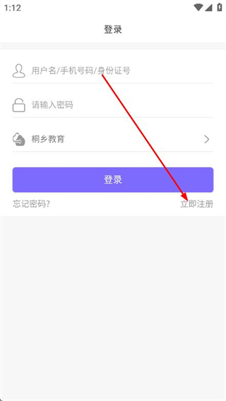 1、打开桐乡教育app,在登录页面点击立即注册按钮。