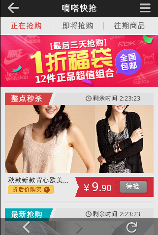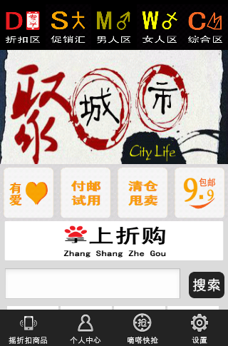 3.软件设立独有的各种最低折扣(a.9.9包邮 b.淘金币购物 c.品牌特卖1折起 d.嘀嗒快抢半价秒杀 e.男人,女人,母婴,综合折扣区)。