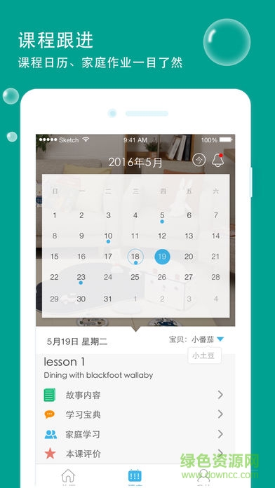 2、课程表:随时查看上课日程,已上过的课还可以查看故事内容、学习宝典与家庭学习。