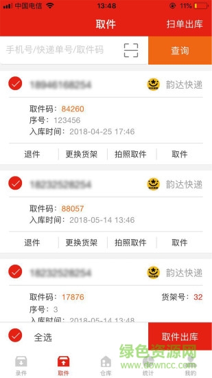 1.快递出库,扫码出库,单号后5位,手机号出库