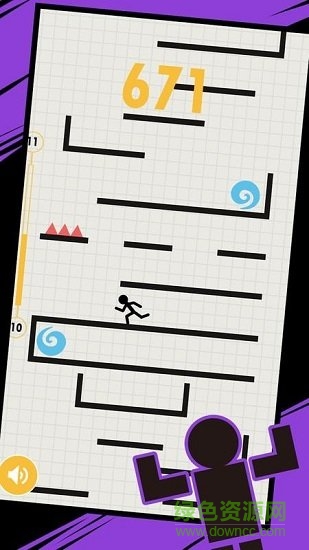 跳跃类的休闲游戏,英文名为Foldman,由Onepear出品。玩家需要控制一个小人,在手绘的迷宫平台中左右来回跳跃,玩家每一次跳跃,都会改变小人的奔跑方向,时刻注意上升过程中的陷阱和机关,保证自身的安全,以完成不同的关卡。